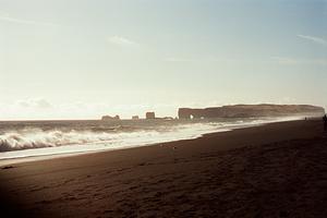 Reynisfjara, Iceland's famous black sand beach, is located on the South Coast near Vík í Mýrdal and is known for its dramatic basalt columns, powerful waves, and the Reynisdrangar sea stacks. Captured on 35mm Cinestill 400D pushed 1 stop. Hi-res scan