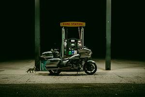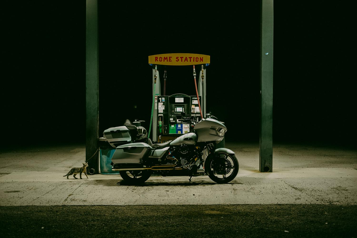 Riding into the Night on Oregon's desolate Highway 95 with hours to go, this lone fill station led to an encounter with a stray cross-eyed cat who became curious of the rumbling machine (and beef jerky in the saddlebags).